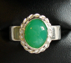 The ring is handcrafted from Sterling Silver (925/1000) with a Fine Silver (999/1000) bezel and surround. The Chrysoprase cabochon is sourced from Australia, noted for the high quality of the delicately-colored green gemstones. Size = Q 1/2