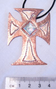 Inspired by Byzantine and Medieval crucifixes which were a standard item of jewellery for both sexes and all classes, though made in a variety of materials from wood to gold. The original type would have been constructed from uncut diamond and gold. N.B. This picture shows the natural patina which has developed over a six-month period. A copper piece can be maintained in it's original bright and shiny state by regular polishing - it's a matter of personal preference.