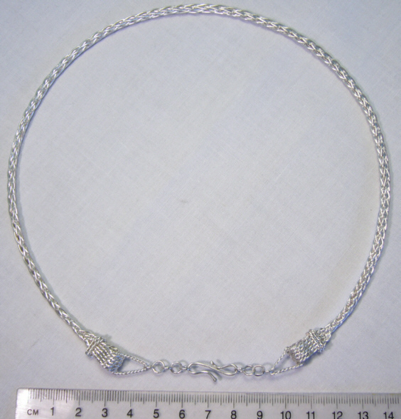 This find is one of the major hoards of Early Christian silver plate from the period around 400 CE. This semi-flexible torc-necklace is constructed from Fine Silver (999/1000), and the finger-loop woven section is 36cm long. The piece has a total weight of 21.47 gms of Fine Silver, with an additional 1.0 gm of Sterling Silver used for the connectors. |